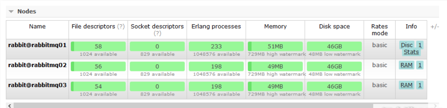 # rabbit01工作模式为磁盘节点;rabbit02和03为内存节点模式